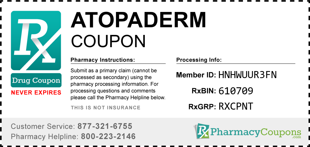 Simply bring the coupon below to the pharmacy, and save on Atopaderm at CVS, Walgreens, Publix, Safeway, Albertsons, Rite Aid, Target, and many other drug stores! These coupons are free and can be used to save up to 80% on all medications.