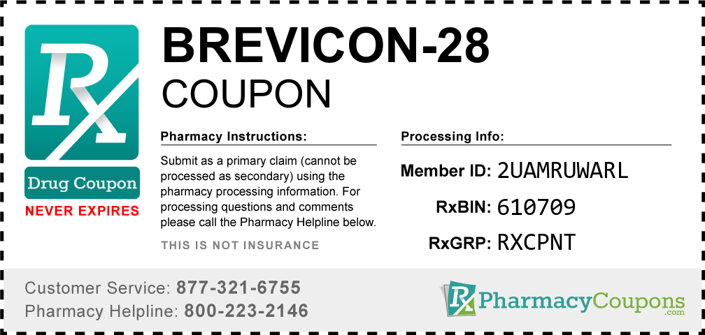 Simply bring the coupon below to the pharmacy, and save on Brevicon-28 at CVS, Walgreens, Publix, Safeway, Albertsons, Rite Aid, Target, and many other drug stores! These coupons are free and can be used to save up to 80% on all medications.
