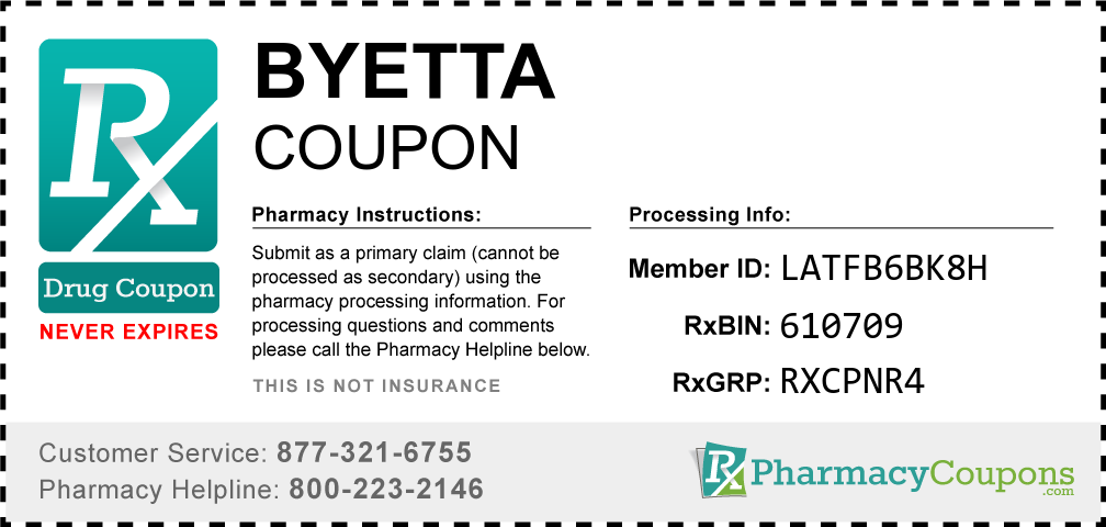 Simply bring the coupon below to the pharmacy, and save on Byetta at CVS, Walgreens, Publix, Safeway, Albertsons, Rite Aid, Target, and many other drug stores! These coupons are free and can be used to save up to 80% on all medications.