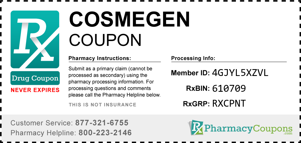 Simply bring the coupon below to the pharmacy, and save on Cosmegen at CVS, Walgreens, Publix, Safeway, Albertsons, Rite Aid, Target, and many other drug stores! These coupons are free and can be used to save up to 80% on all medications.