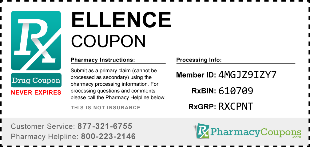 Simply bring the coupon below to the pharmacy, and save on Ellence at CVS, Walgreens, Publix, Safeway, Albertsons, Rite Aid, Target, and many other drug stores! These coupons are free and can be used to save up to 80% on all medications.