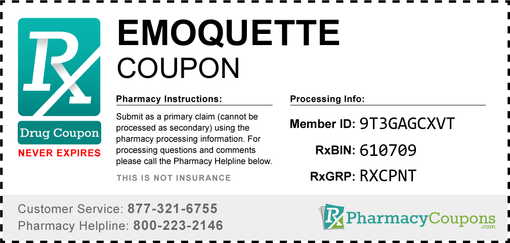 Simply bring the coupon below to the pharmacy, and save on Emoquette at CVS, Walgreens, Publix, Safeway, Albertsons, Rite Aid, Target, and many other drug stores! These coupons are free and can be used to save up to 80% on all medications.