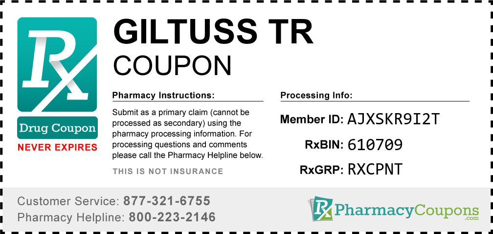 Simply bring the coupon below to the pharmacy, and save on Giltuss tr at CVS, Walgreens, Publix, Safeway, Albertsons, Rite Aid, Target, and many other drug stores! These coupons are free and can be used to save up to 80% on all medications.