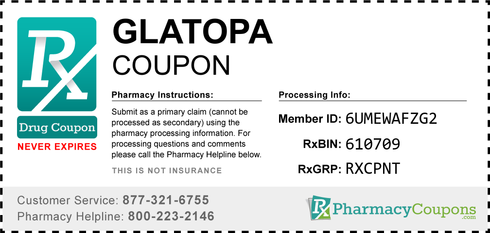 Simply bring the coupon below to the pharmacy, and save on Glatopa at CVS, Walgreens, Publix, Safeway, Albertsons, Rite Aid, Target, and many other drug stores! These coupons are free and can be used to save up to 80% on all medications.