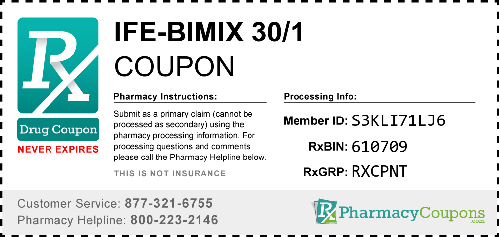 Simply bring the coupon below to the pharmacy, and save on Ife-bimix 30/1 at CVS, Walgreens, Publix, Safeway, Albertsons, Rite Aid, Target, and many other drug stores! These coupons are free and can be used to save up to 80% on all medications.