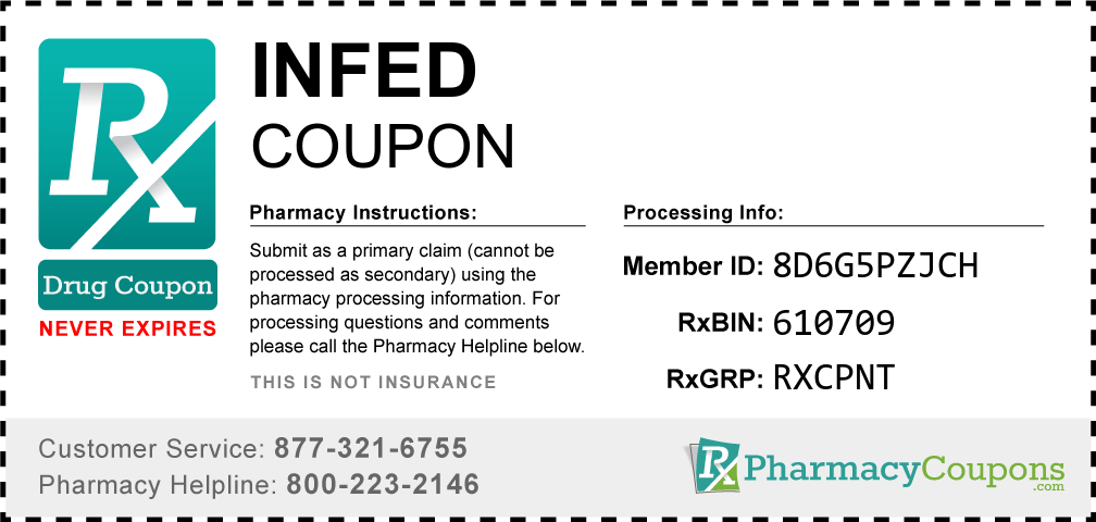 Simply bring the coupon below to the pharmacy, and save on Infed at CVS, Walgreens, Publix, Safeway, Albertsons, Rite Aid, Target, and many other drug stores! These coupons are free and can be used to save up to 80% on all medications.