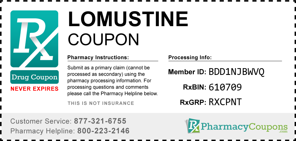 Simply bring the coupon below to the pharmacy, and save on Lomustine at CVS, Walgreens, Publix, Safeway, Albertsons, Rite Aid, Target, and many other drug stores! These coupons are free and can be used to save up to 80% on all medications.