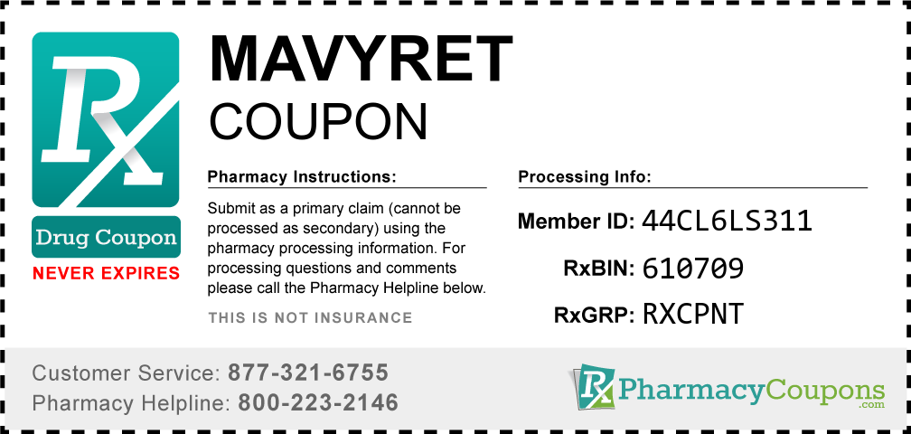 Simply bring the coupon below to the pharmacy, and save on Mavyret at CVS, Walgreens, Publix, Safeway, Albertsons, Rite Aid, Target, and many other drug stores! These coupons are free and can be used to save up to 80% on all medications.