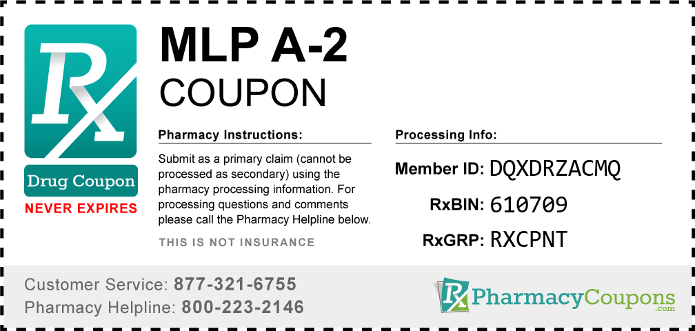 Simply bring the coupon below to the pharmacy, and save on Mlp a-2 at CVS, Walgreens, Publix, Safeway, Albertsons, Rite Aid, Target, and many other drug stores! These coupons are free and can be used to save up to 80% on all medications.