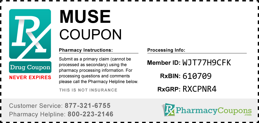 Simply bring the coupon below to the pharmacy, and save on Muse at CVS, Walgreens, Publix, Safeway, Albertsons, Rite Aid, Target, and many other drug stores! These coupons are free and can be used to save up to 80% on all medications.