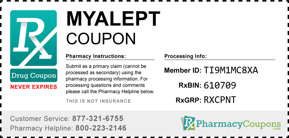 Simply bring the coupon below to the pharmacy, and save on Myalept at CVS, Walgreens, Publix, Safeway, Albertsons, Rite Aid, Target, and many other drug stores! These coupons are free and can be used to save up to 80% on all medications.
