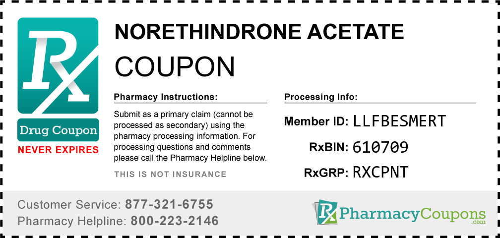Simply bring the coupon below to the pharmacy, and save on Norethindrone acetate at CVS, Walgreens, Publix, Safeway, Albertsons, Rite Aid, Target, and many other drug stores! These coupons are free and can be used to save up to 80% on all medications.