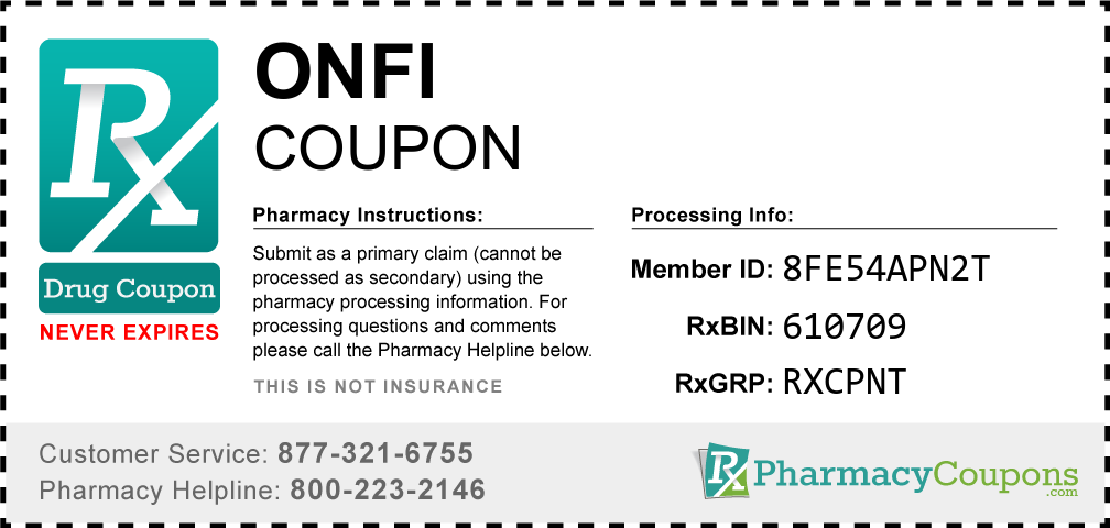 Simply bring the coupon below to the pharmacy, and save on Onfi at CVS, Walgreens, Publix, Safeway, Albertsons, Rite Aid, Target, and many other drug stores! These coupons are free and can be used to save up to 80% on all medications.