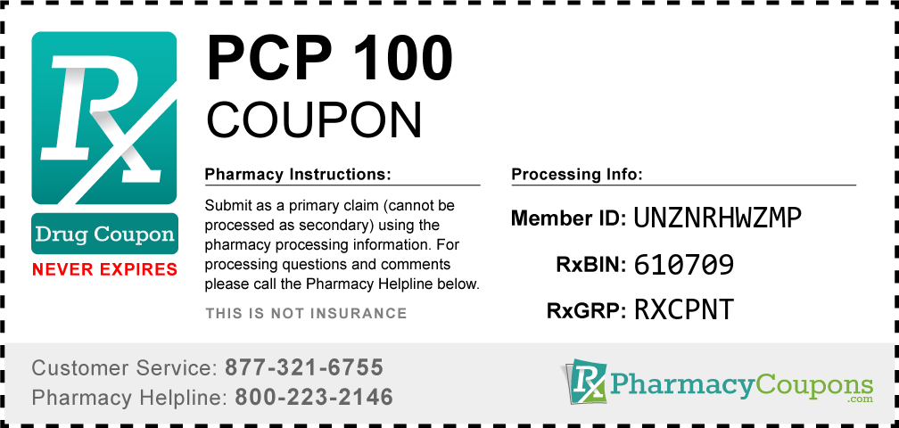Simply bring the coupon below to the pharmacy, and save on Pcp 100 at CVS, Walgreens, Publix, Safeway, Albertsons, Rite Aid, Target, and many other drug stores! These coupons are free and can be used to save up to 80% on all medications.