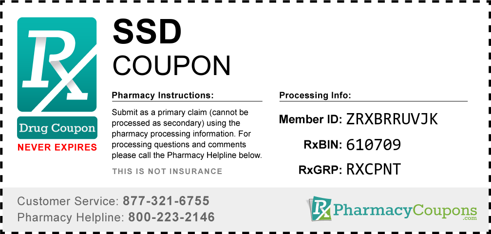 Simply bring the coupon below to the pharmacy, and save on Ssd at CVS, Walgreens, Publix, Safeway, Albertsons, Rite Aid, Target, and many other drug stores! These coupons are free and can be used to save up to 80% on all medications.