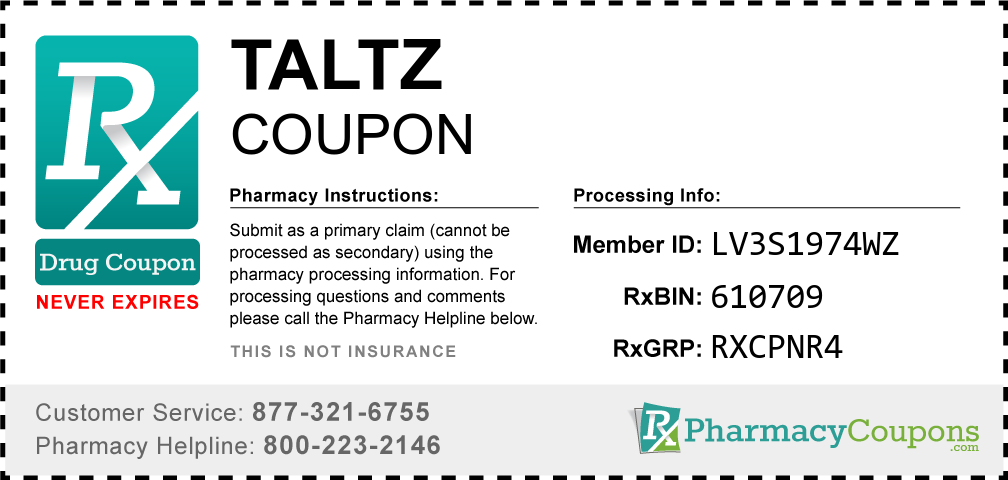 Simply bring the coupon below to the pharmacy, and save on Taltz at CVS, Walgreens, Publix, Safeway, Albertsons, Rite Aid, Target, and many other drug stores! These coupons are free and can be used to save up to 80% on all medications.