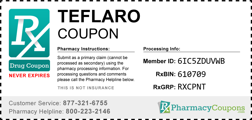 Simply bring the coupon below to the pharmacy, and save on Teflaro at CVS, Walgreens, Publix, Safeway, Albertsons, Rite Aid, Target, and many other drug stores! These coupons are free and can be used to save up to 80% on all medications.