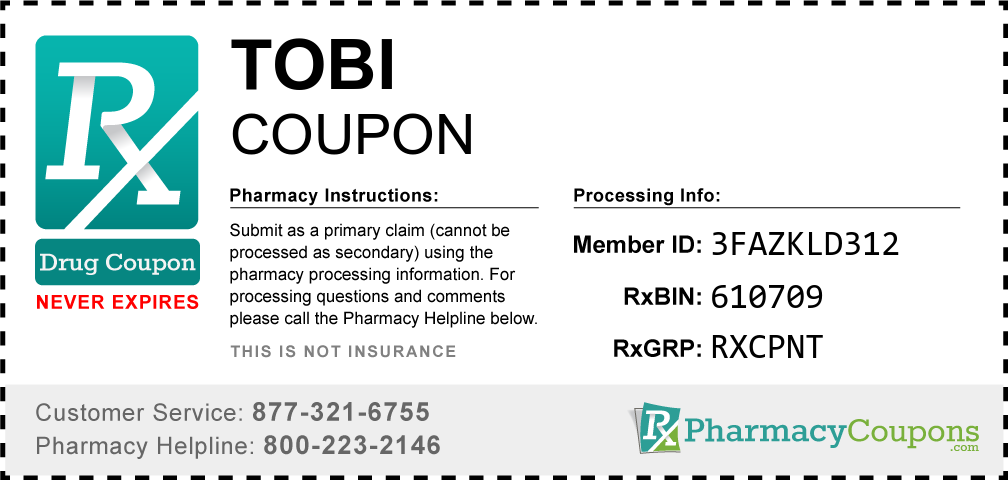 Simply bring the coupon below to the pharmacy, and save on Tobi at CVS, Walgreens, Publix, Safeway, Albertsons, Rite Aid, Target, and many other drug stores! These coupons are free and can be used to save up to 80% on all medications.