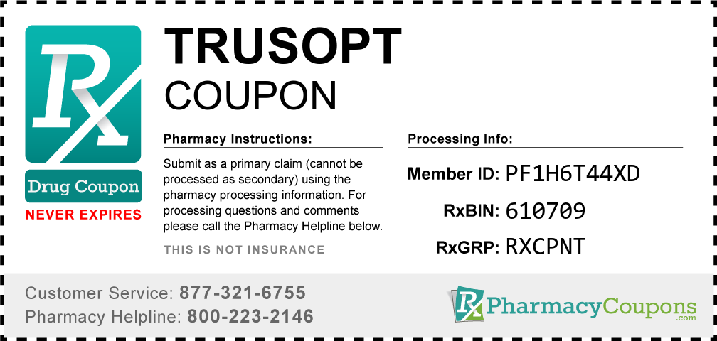 Simply bring the coupon below to the pharmacy, and save on Trusopt at CVS, Walgreens, Publix, Safeway, Albertsons, Rite Aid, Target, and many other drug stores! These coupons are free and can be used to save up to 80% on all medications.