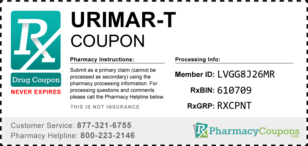 Simply bring the coupon below to the pharmacy, and save on Urimar-t at CVS, Walgreens, Publix, Safeway, Albertsons, Rite Aid, Target, and many other drug stores! These coupons are free and can be used to save up to 80% on all medications.