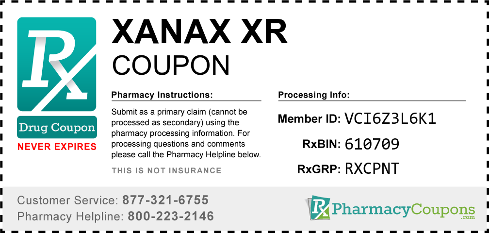 Simply bring the coupon below to the pharmacy, and save on Xanax xr at CVS, Walgreens, Publix, Safeway, Albertsons, Rite Aid, Target, and many other drug stores! These coupons are free and can be used to save up to 80% on all medications.