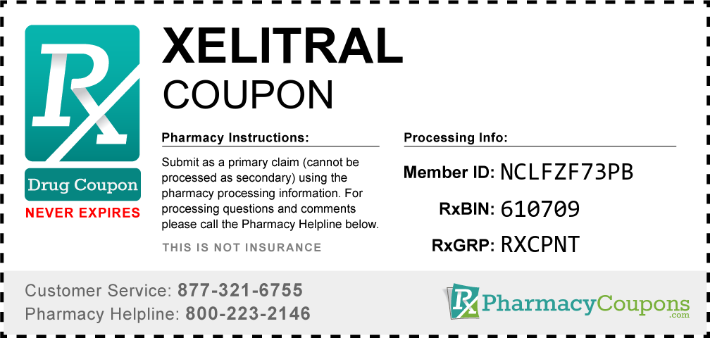 Simply bring the coupon below to the pharmacy, and save on Xelitral at CVS, Walgreens, Publix, Safeway, Albertsons, Rite Aid, Target, and many other drug stores! These coupons are free and can be used to save up to 80% on all medications.